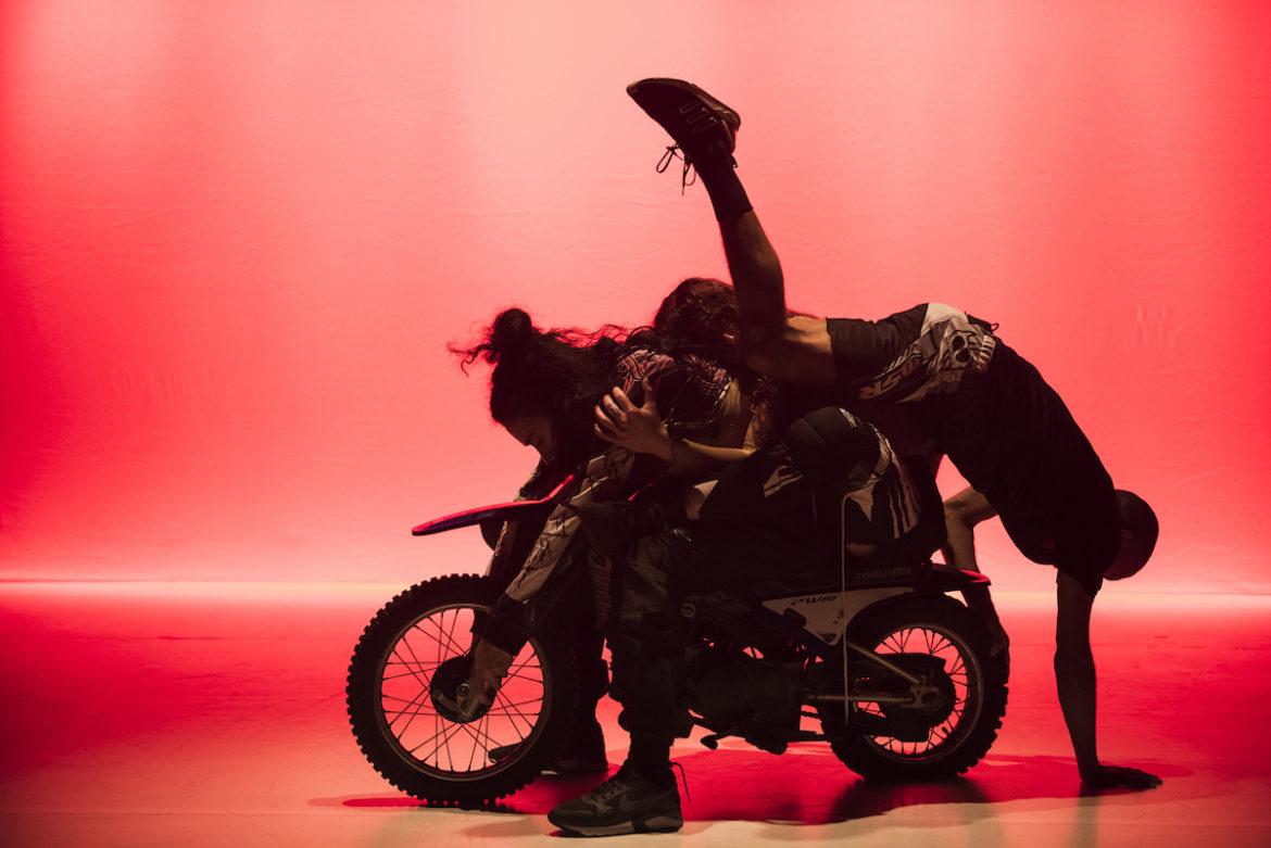 The motorbike is a constant focus of the dancers’ attention. They ride it like lovers, kiss it, caress it, or use it as a weapon to run into each other’s prone bodies. It’s empowerment and disempowerment, lubricious and unyielding. The motorbike is never actually started: it’s pushed around the stage by the dancers. One dancer steps off it and kisses her biceps, her hands, all up her arms. She knows that the only real power of this machine is her own strength.
