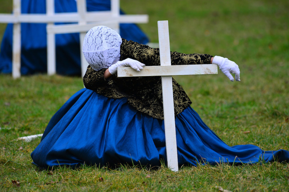 The pickets, we soon realise, are being placed into a grid pattern that looks for all the world like an old military cemetery, with row upon row of white crosses, some of them elegiacally tilted. It all feels very allegorical. But precisely what is intended?