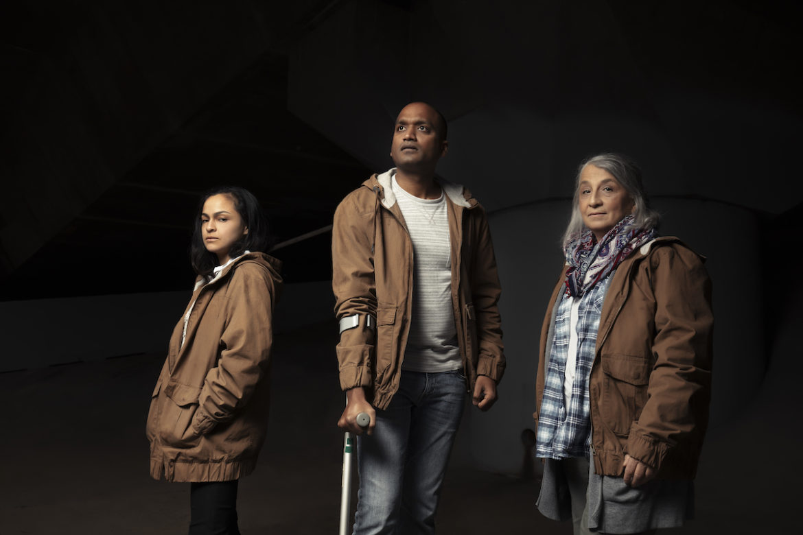 It is the latter here. We audience mingle around the area designated as a foyer. Most are engrossed in their own conversations when the voice begins to issue from the speaker, telling us numbers of survivors elsewhere, sharing news of their community’s misfortunes, counting out the days since…. What?