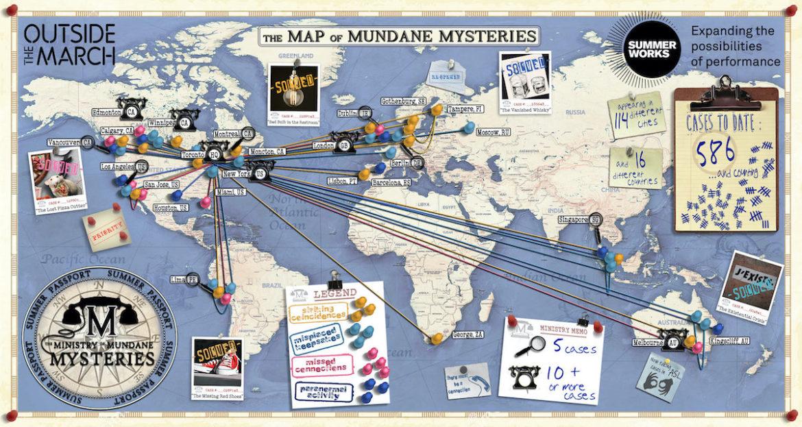 The Ministry of Mundane Mysteries created by Nick Blais, Katherine Cullen, Mitchel Cushman, Anahita Dehbonehie, Colin Doyle, Sebastien Heins, Amy Keating, Griffin McInnes. Performed by Christy Bruce, Jamie Cavanagh, Katherine Cullen, Shannon Currie, Colin Doyle, Sheri Godda, Sebastien Heins, Toby Highs, Liz Johnston, Thurga Kanagasekarampillai, Amy Keating, Connor Low, Francis Melling, Anand Rajaram, Jonathan Shaboo, Jillian Welsh and Connor Yuzewenko-Martin. A CAEA production produced by Outside the March and presented by Summerworks.