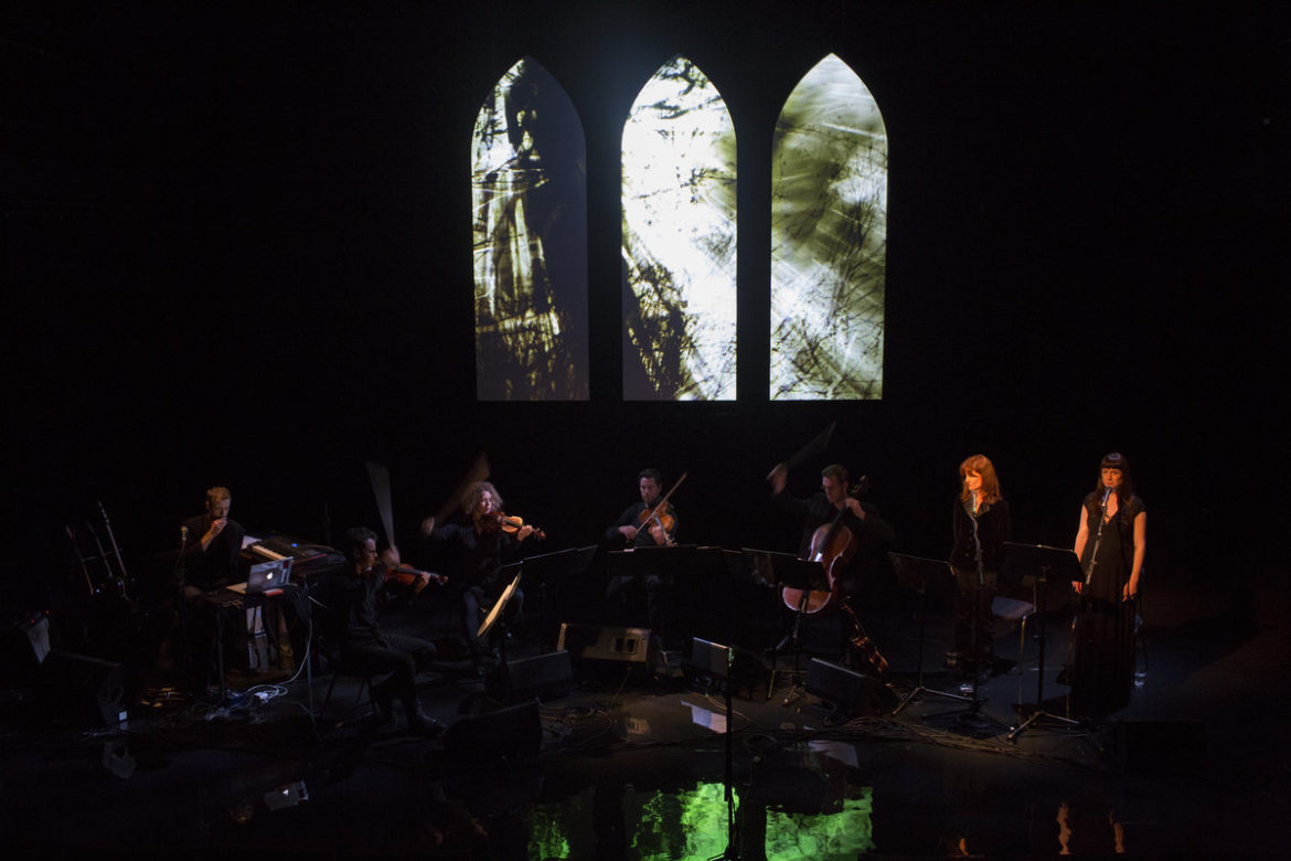 Gothic, composition and arrangements by Andree Greenwell, original lyrics by Hilary Bell, Alison Croggon, Maryanne Lynch, Felicity Plunkett, and Hugo Race. Visual projection design and animation by Michaela French. Screen and lighting design by Neil Simpson. Audio design and electronica by David Trumpmanis and Andree Greenwell. Performed by Vocalists Jessica O’Donoghue and Andree Greenwell, Violins by Andrea Keeble and Kylie Morrigan, Viola by Joshua Stilwell, Cello by Noella Yan, Electric Guitar and on-stage audio by David Trumpmanis. Gothic at the Melbourne Arts Centre.