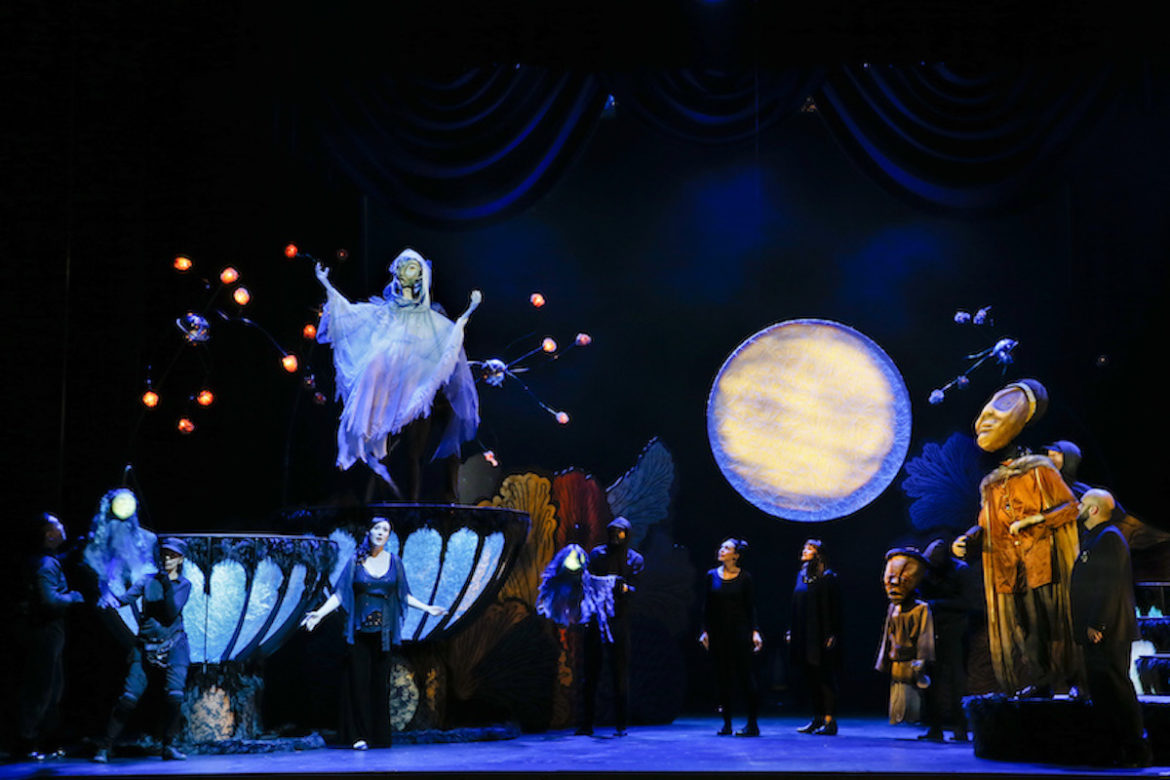 This work is at its core a theatrical hybrid – an elaborate engagement with the meaning of genre and the applications of storytelling. From its folklore basis, to its larger-than-life puppetry to classic opera, the show uses the conventions of each genre to its advantage, combining the child-like innocence of the puppetry world and the grandeur of opera. The direction is aware of the components of each genre and treast them respectfully and intelligently, while also blending them in a form that can be at times humorous – a group of frog puppets performing opera and suddenly switching to line-dancing comes to mind – and yet appropriate.